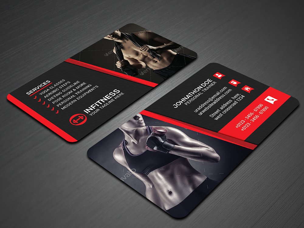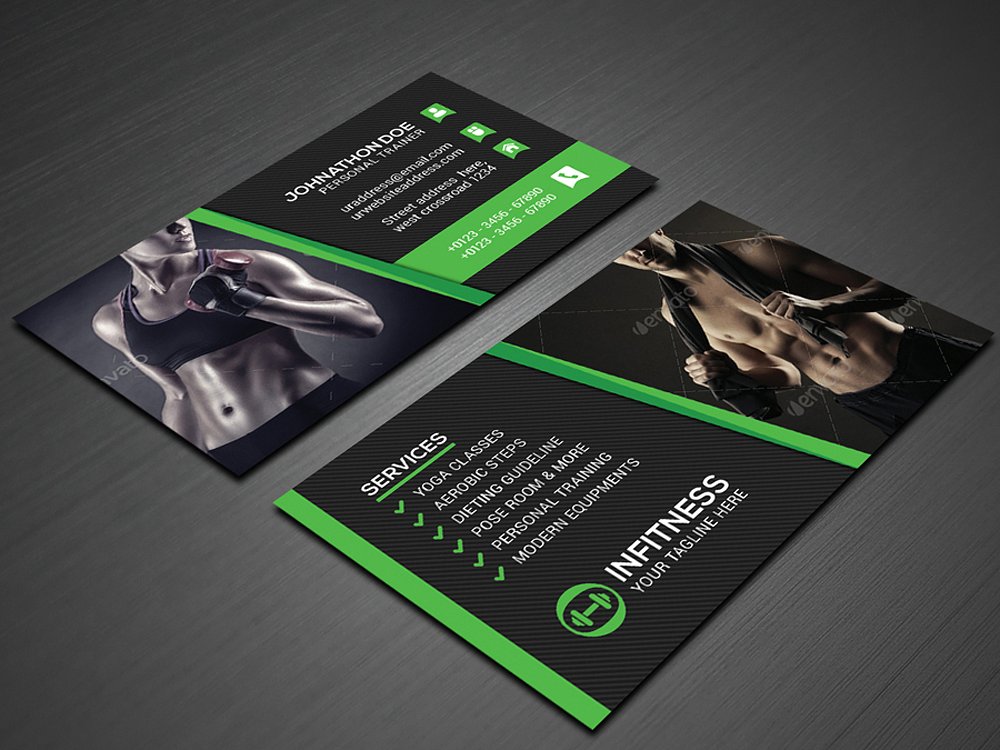 Biglietto da visita scuro ed elegante caratterizzato da uno spazio in ogni facciata per un’ immagine. Ideale per palestre, centri fitness, personal trainers. Le immagini sono di esempio nelle opzioni è possibile scegliere se acquistarle a parte o fornirle gratuitamente. La grafica è versatile e con le immagini adatte può essere utilizzato anche per altri settori.
