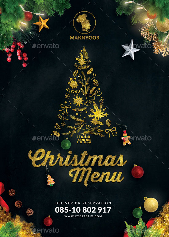 Grafica ricca di dettagli ed elementi natalizi con sfondo scuro ed elementi dorati.
