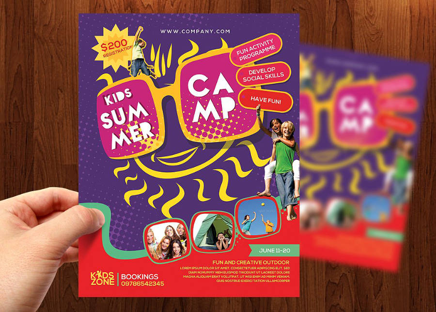Volantino, flyer o poster con la grafica vivace e colorata, ideale per promuovere un campo estivo per ragazzi, summer camp o attività didattiche per bambini. Puoi scegliere anche solo il file senza la stampa. Perfetto per associazioni, centri sportivi che vogliono promuovere con stile il proprio evento. Personalizzabile con le tue foto.