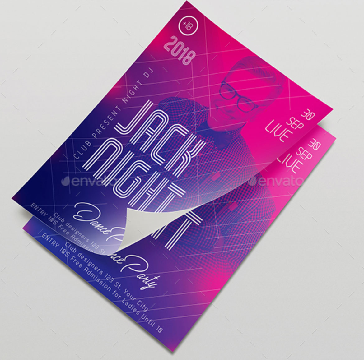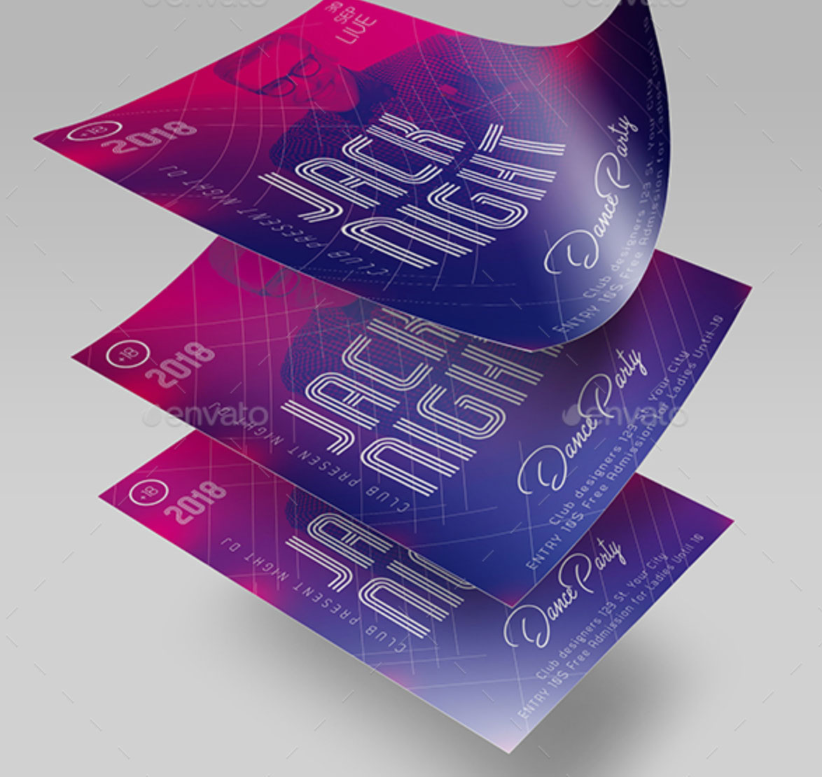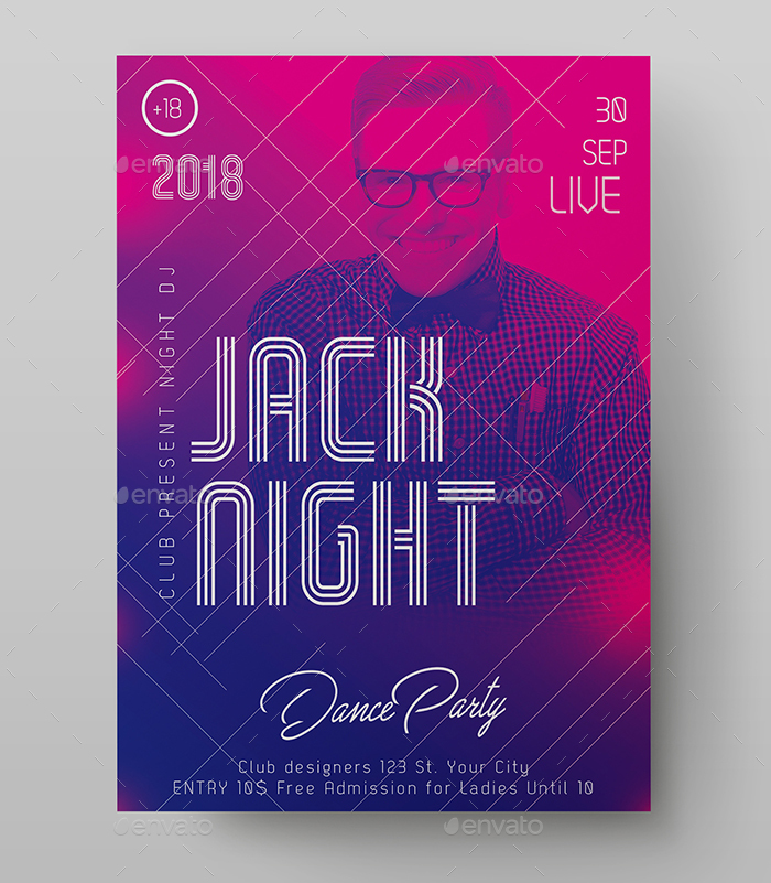 Caratterizzato da una grafica colorata e moderna con grande sfumatura sovrapposta all’immagine di sfondo. Ideale come modello per feste, party, serate a tema per locali e pub.