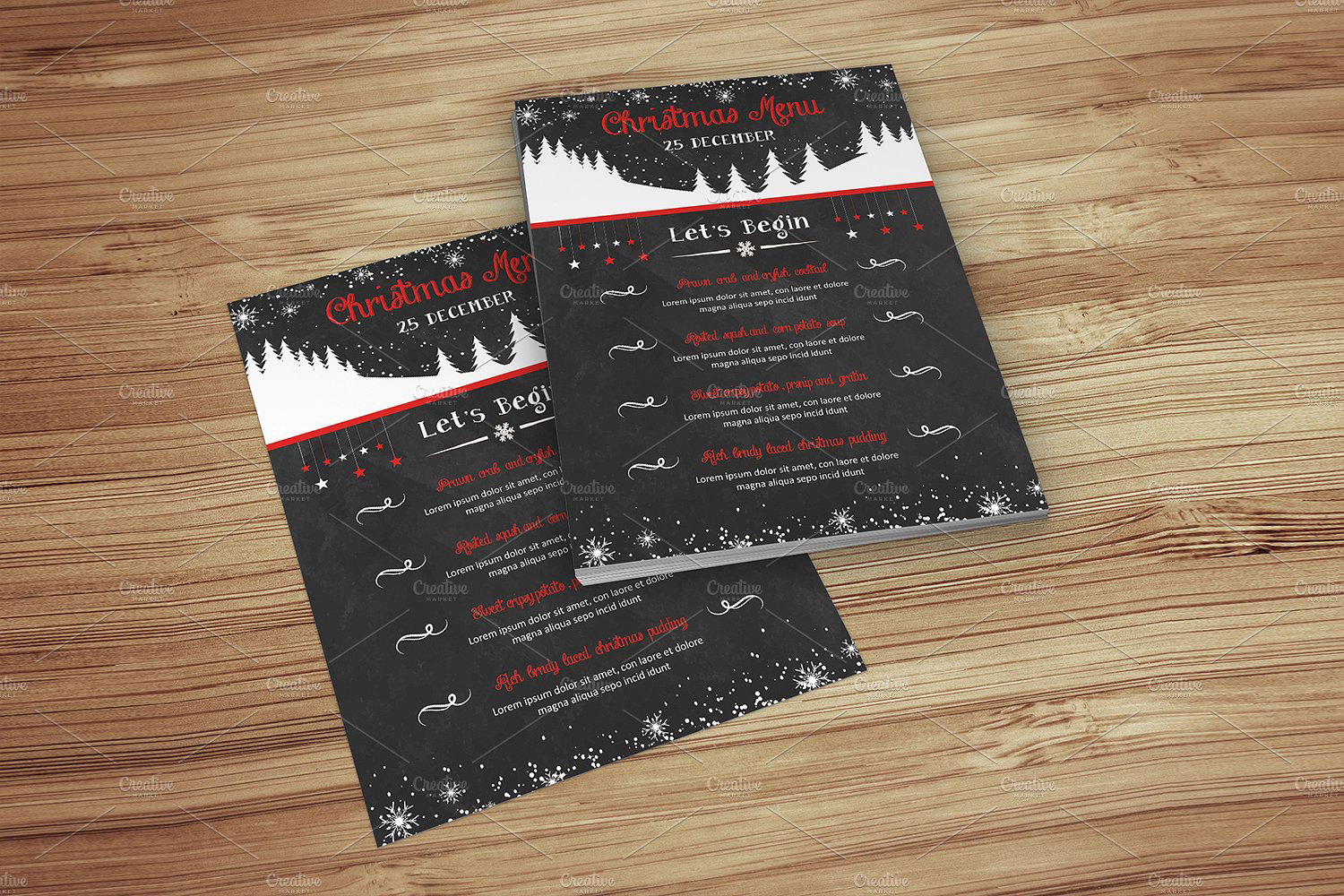 Menù per una cena o pranzo durante le festività natalizie, nero con abeti.