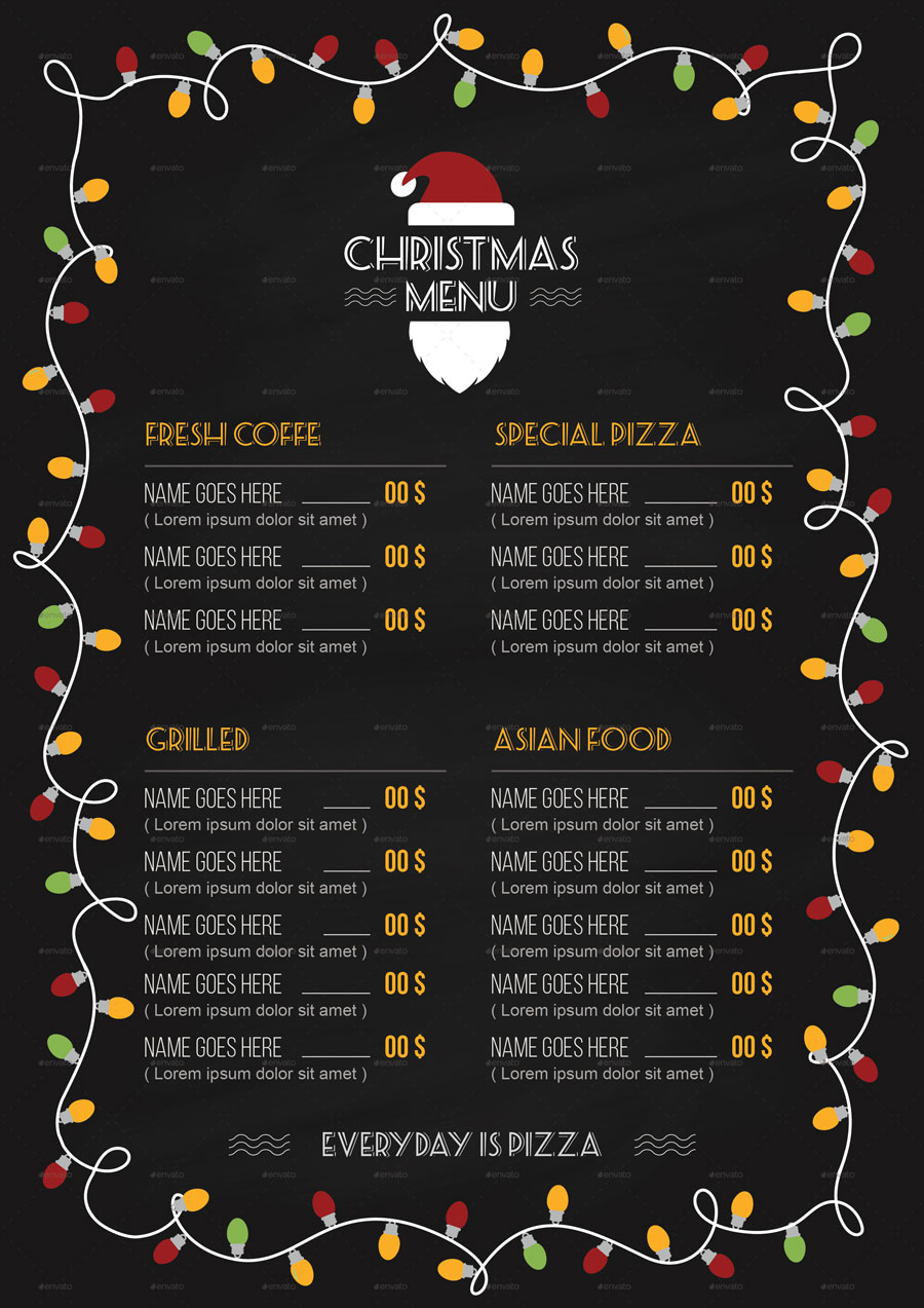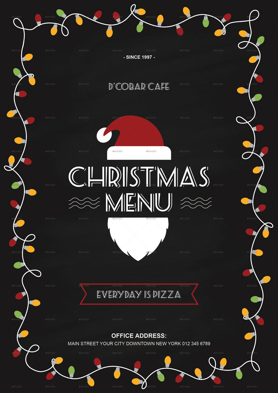 Menù per una cena o pranzo durante le festività di natale o capodanno, nero con ghirlanda colorata.