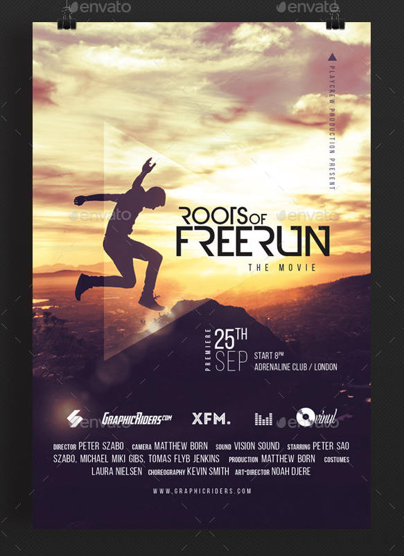 Volantino, flyer o poster adatto per promuovere il tuo evento/attività free-run, parkour, sport. Stupisci tutti con una grafica da film. Immagine inclusa.