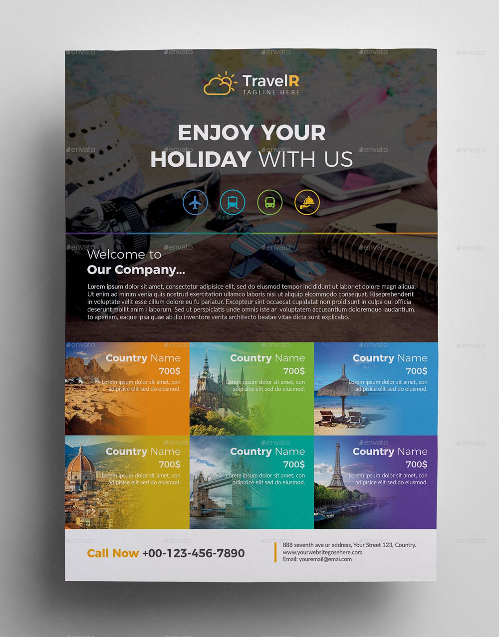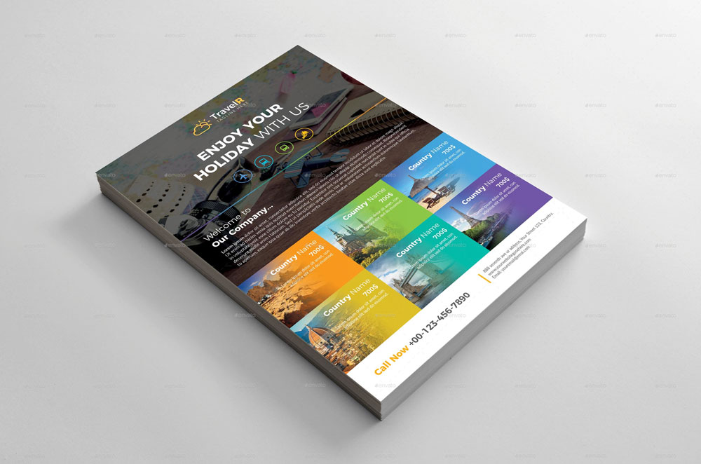 Volantino, poster o cartolina ideale attività turistiche, pacchetti di viaggio, uscite giornaliere o tour. Adatto ad associazioni, guide turistiche/escursionistiche, tour operator, agenzie di viaggio. Ha una grafica colorata e vivace.