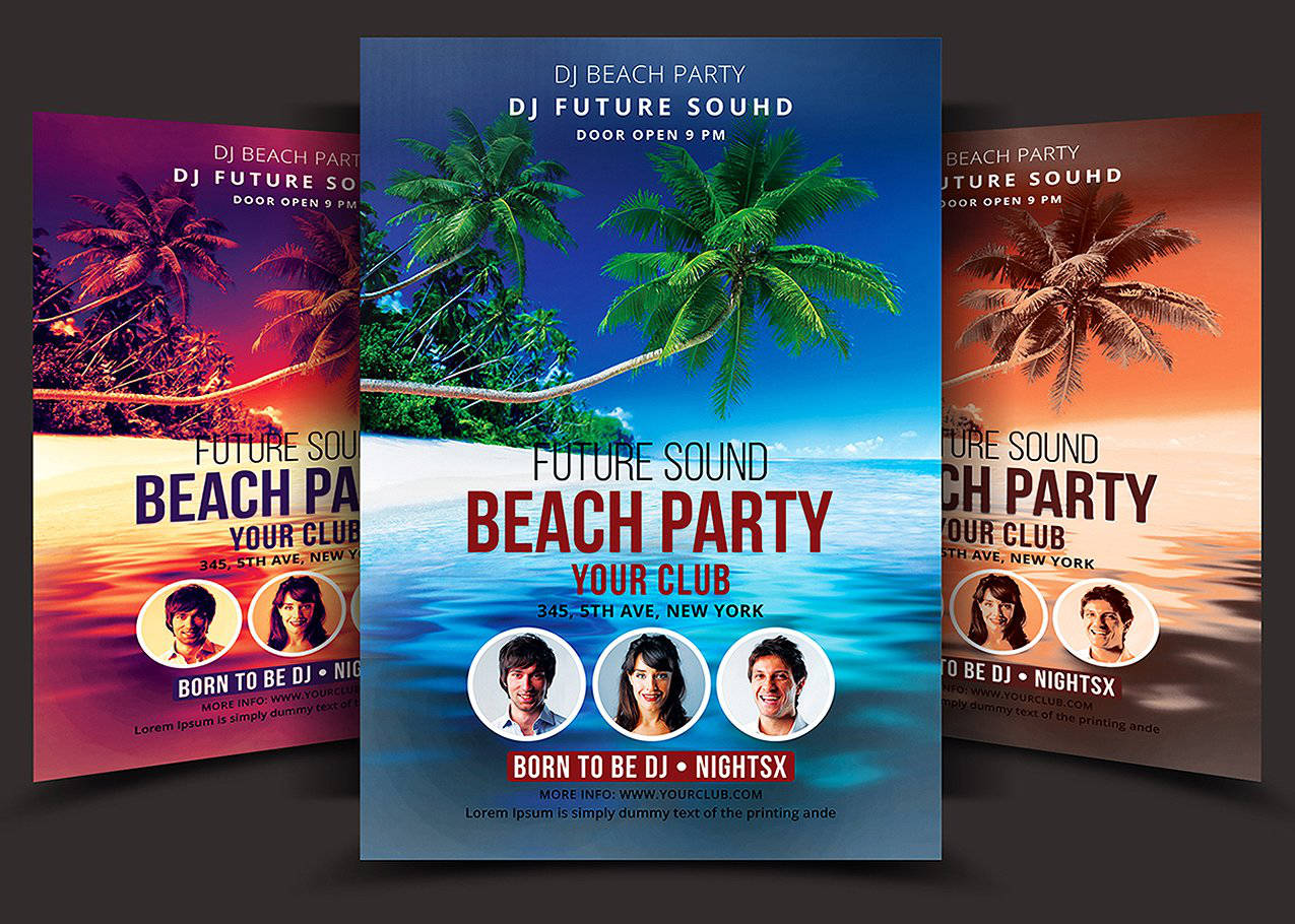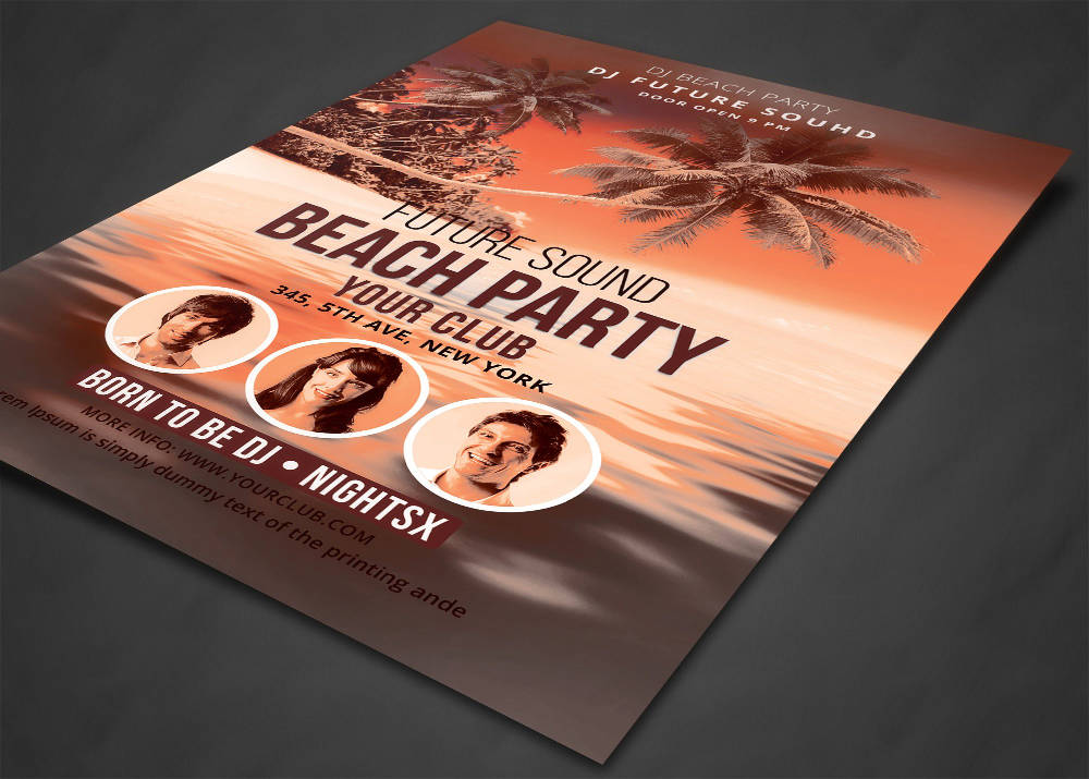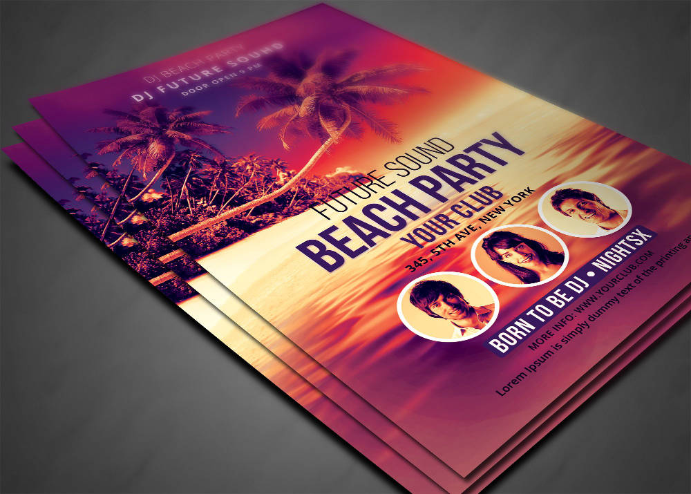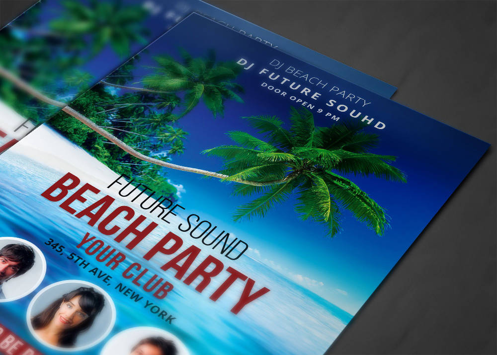Volantino, flyer o poster con la grafica originale e colorata, ideale per promuovere un party o festa sul mare e sulla spiaggia. Puoi scegliere anche solo il file senza la stampa. Perfetto per bagni, pub e locali promuovere con stile il proprio evento. Personalizzabile.