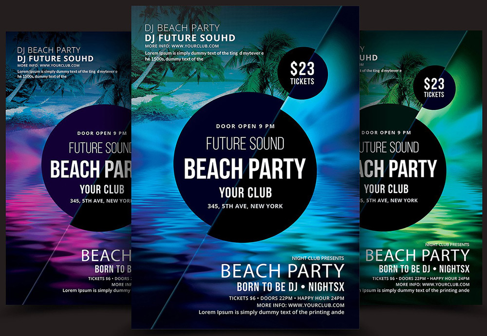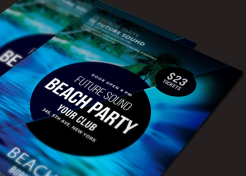 Volantino, flyer o poster con la grafica originale e colorata, ideale per promuovere un party o festa sul mare e sulla spiaggia. Puoi scegliere anche solo il file senza la stampa. Perfetto per bagni, pub e locali promuovere con stile il proprio evento. Personalizzabile.