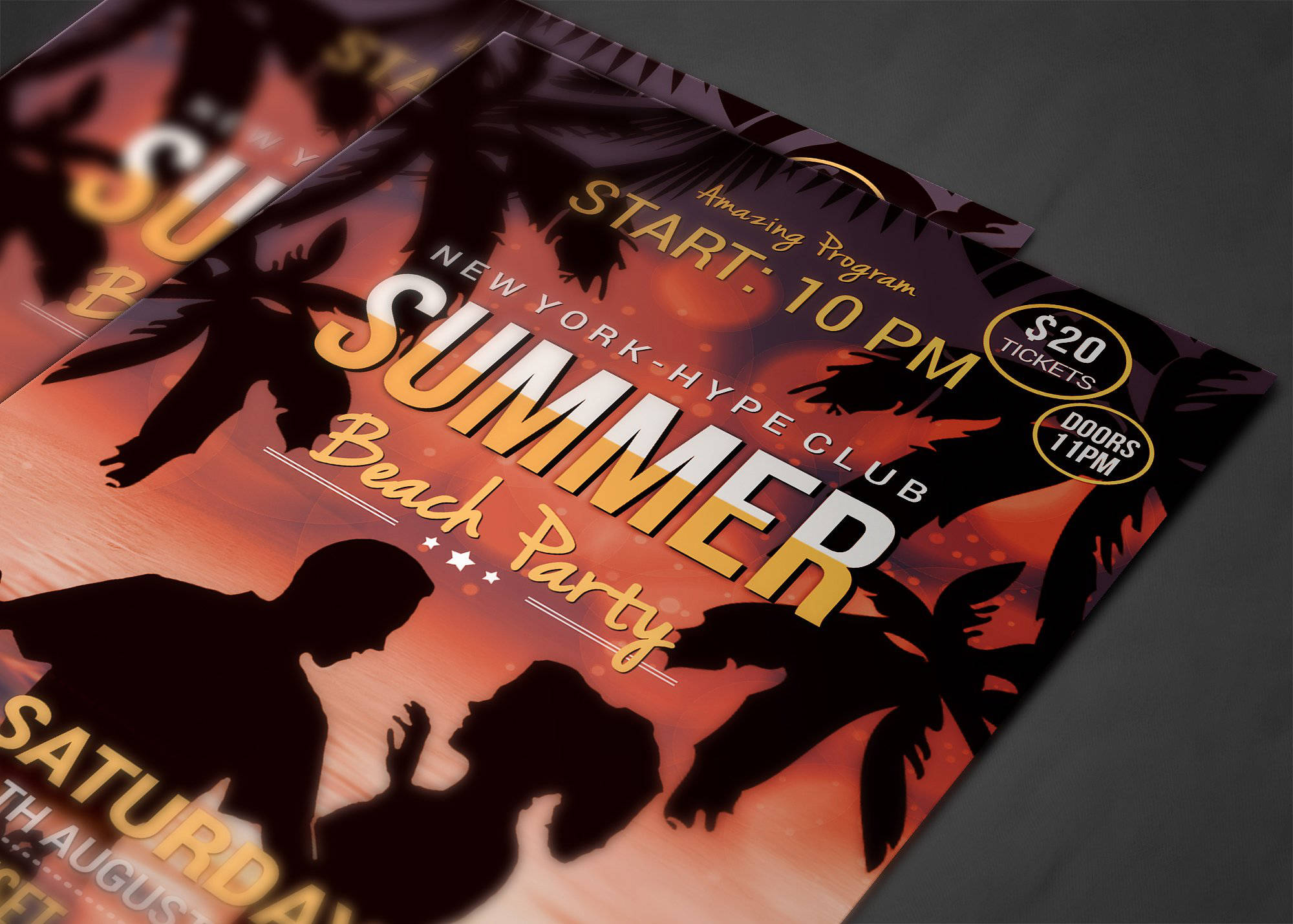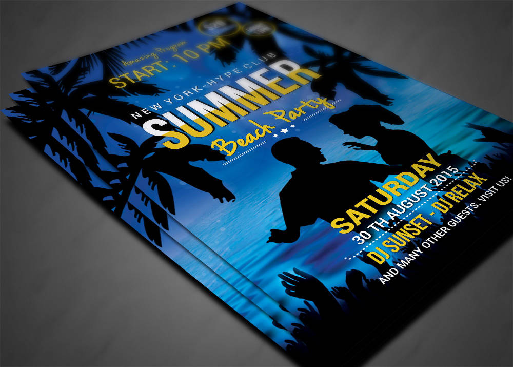 Volantino, flyer o poster con la grafica originale e colorata, ideale per promuovere un party o festa sul mare e sulla spiaggia. Puoi scegliere anche solo il file senza la stampa. Perfetto per bagni, pub e locali promuovere con stile il proprio evento. Personalizzabile.