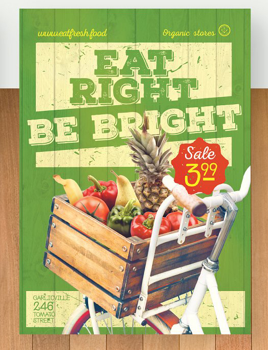 Volantino / cartolina / poster per la promozione di eventi od attività legate al cibo vegano, vegetariano o biologico. Grafica simpatica con le immagini che in questo caso sono incluse senza alcun costo aggiuntivo.Ideale per locali di prodotti alimentari o promozione di ecommerce .