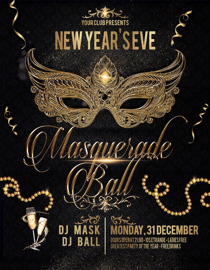 Volantino, flyer o cartolina di presentazione ideale promuovere una festa di Carnevale per il tuo locale. Grafica con maschera ricca di dettagli e spazio per le informazioni dallo stile moderno.