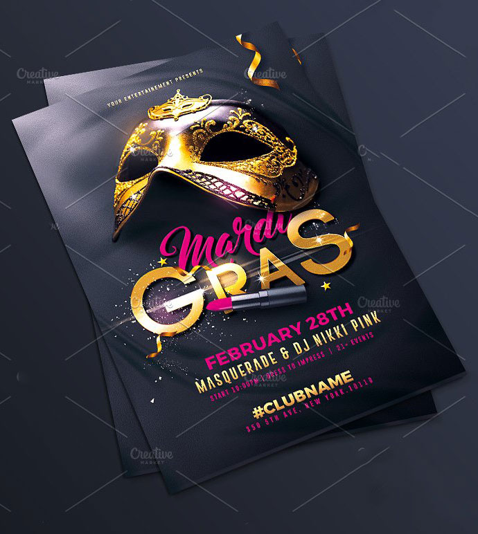 Volantino, flyer o cartolina di presentazione ideale promuovere una festa di Carnevale per il tuo locale. Grafica con maschera ricca di dettagli e spazio per le informazioni dallo stile moderno.