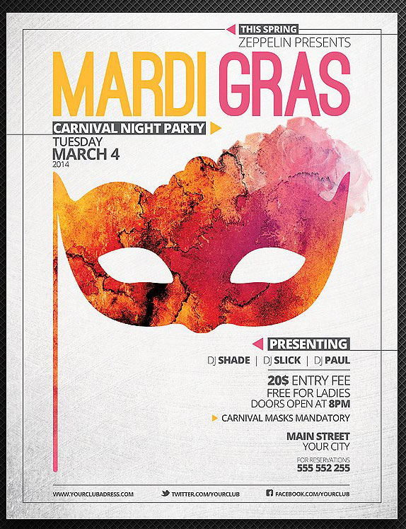 Volantino, flyer o cartolina di presentazione ideale promuovere una festa di Carnevale per il tuo locale. Grafica con maschera ricca di dettagli e spazio per le informazioni dallo stile moderno.