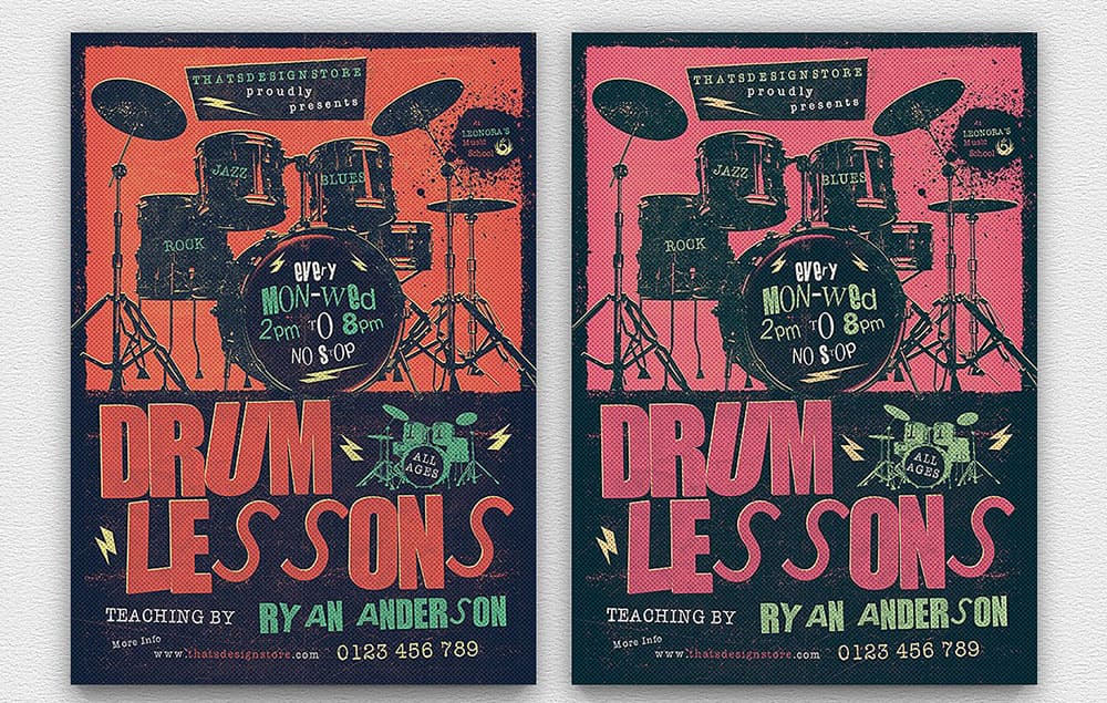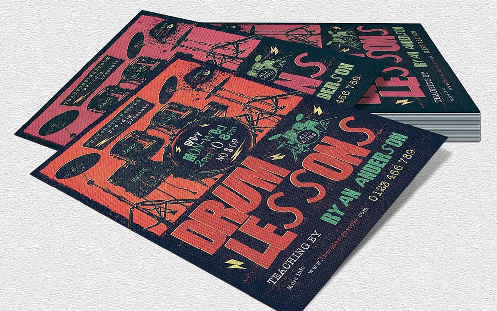 Volantino, flyer o cartolina. Ideale per scuole di musica o lezioni private di batteria. Una grafica caratteristica e molto curata, ideale per distinguerti in maniera professionale.